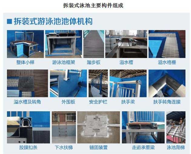 拆裝式游泳池又稱活動泳池或拼裝式游泳池、拼裝泳池;也是近些年市場涌現出的一種新型游泳池產品。其原理是在工廠完成所有標準構件的定制生產、采用現場拼裝作業(yè)方式完成各種規(guī)格游泳池設施的組裝建設。拆裝式游泳池可以根據用戶使用需求快速安裝于大多數符合要求的簡單平整場地、相對于普通土建游泳池而言具有顯著的場地適應性和反復安裝拆卸特性,故命名為拆裝式游泳池。按照國家標準,拆裝式游泳池應該能夠提供普通游泳場館的所有訓練與比賽功能要求。