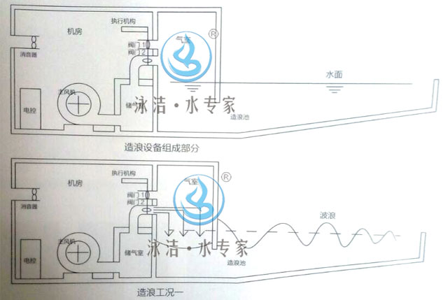 氣壓造浪系統(tǒng)主要蓄壓室、風機、閥門機構(gòu)、風管系統(tǒng)、電子智能造浪是一項多學科綜合性的設備工程,它涉及空氣動力學、波浪力學、機械學、電氣控制系統(tǒng)學等幾門學科。但關于波浪產(chǎn)生的基本原理,可以形象而通俗的概括為一句成語興風作浪。它與海嘯產(chǎn)生原理基本一致,都是由于壓力的變化而形成波浪。